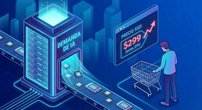 Estos servidores de IA no funcionan con discos duros normales. Necesitan Enterprise SSDs (discos de ultra-velocidad) para mover terabytes de datos en milisegundos. El boom de la IA ha provocado que gigantes como Microsoft, Google y Meta estén comprando toda la capacidad de almacenamiento disponible en el mercado.